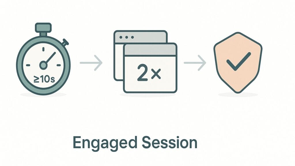 I GA4 är en engagerad session ett besök som varar minst 10 sekunder, har fler än en sidvisning, eller leder till en konvertering. Det filtrerar bort snabba klick och visar det som faktiskt har värde.