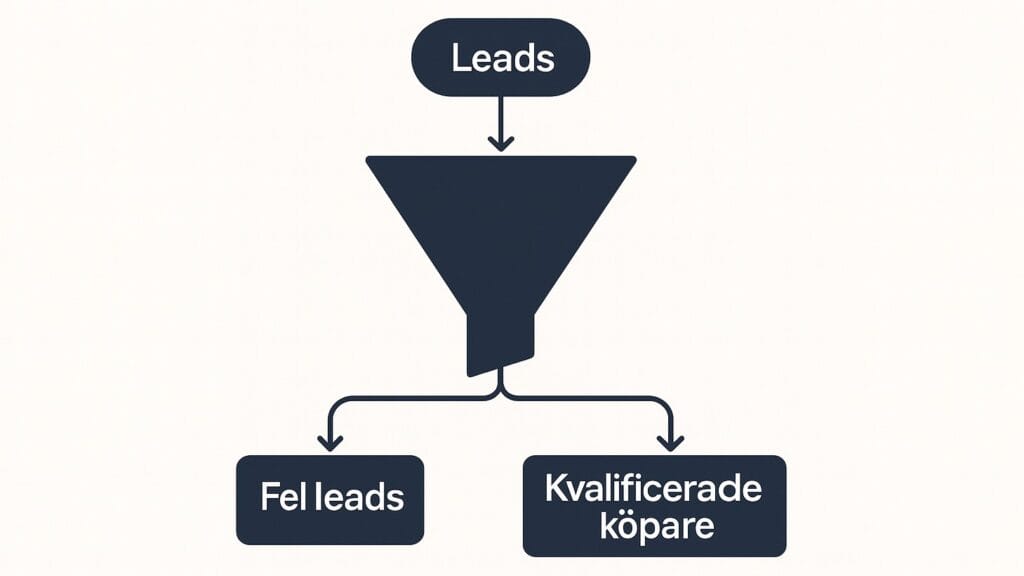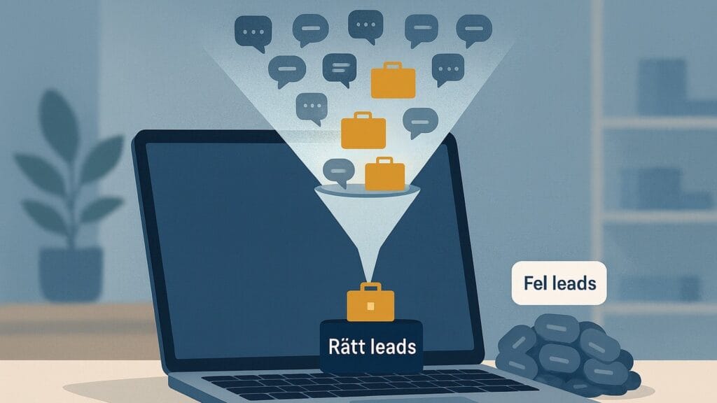 Alla leads är inte värdefulla — alltså, alla som fyller i ett formulär eller tar kontakt. Ofta behöver vi styra rätt personer att ta nästa steg och samtidigt minska risken att fel personer gör det. Det kan kännas ovant, eftersom man inte vill exkludera någon. Därför har många företag en “stor håv” ute, vilket gör att teamet måste lägga onödigt mycket tid på att sålla bort irrelevanta kontakter